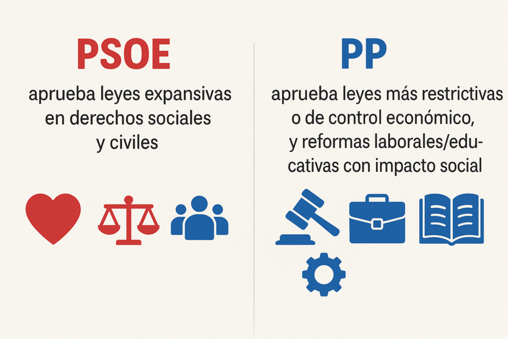 En conclusión, la trayectoria política de España refleja dos modelos claramente diferenciados en materia social. El PSOE ha actuado como motor de la ampliación de derechos sociales, civiles y de igualdad, consolidando un Estado del Bienestar más inclusivo y garantista. Por su parte, el PP ha puesto el acento en la estabilidad económica, el fortalecimiento de la familia tradicional y la colaboración público-privada, lo que en épocas de crisis se ha traducido en una reducción o freno de determinados avances sociales.